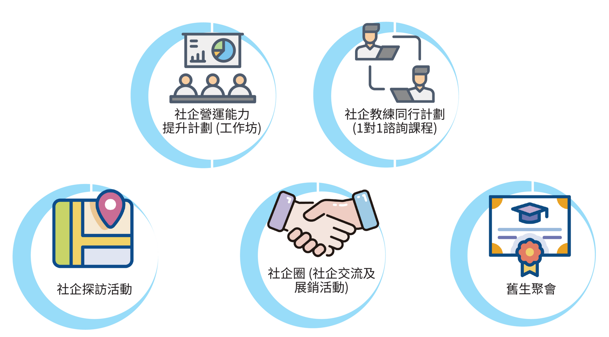 「社企圈」為計劃的焦點活動,結合社企展銷、交流配對及主題分享,讓社企能向公眾及不同持份者展示產品/服務,同時建立合作連結。